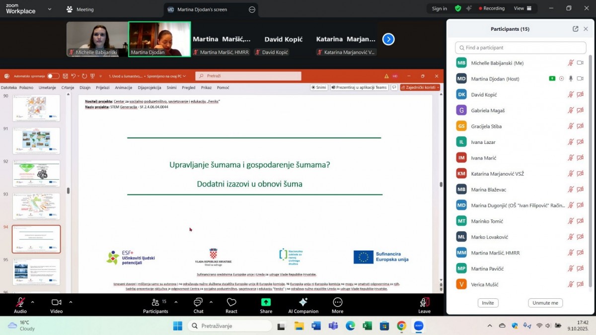 Kroz predavanja, primjere iz prakse i stručnu raspravu, sudionici su produbili razumijevanje o ulozi šumskih ekosustava u ublažavanju klimatskih promjena, važnosti prirodnih staništa te odgovornom upravljanju resursima.