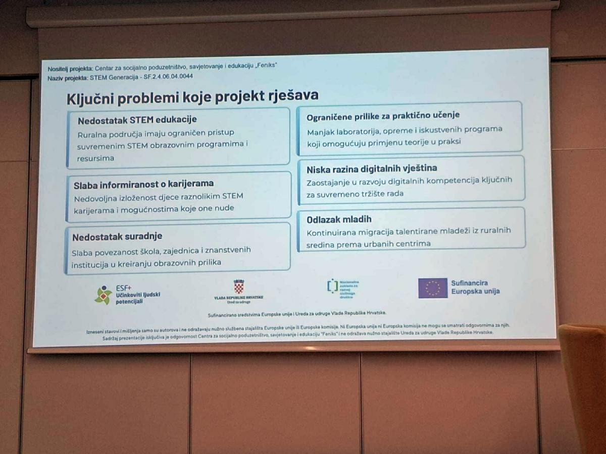 Sudionicima su predstavljeni ciljevi, aktivnosti i rezultati projekta, uz naglasak na ključne probleme koje projekt rješava – nedostatak STEM edukacije u ruralnim područjima, slabu informiranost djece o STEM karijerama, nedostatak suradnje između škola, zajednica i znanstvenih institucija, ograničene prilike za praktično učenje, nisku razinu digitalnih vještina te odlazak mladih iz manjih sredina prema urbanim centrima.